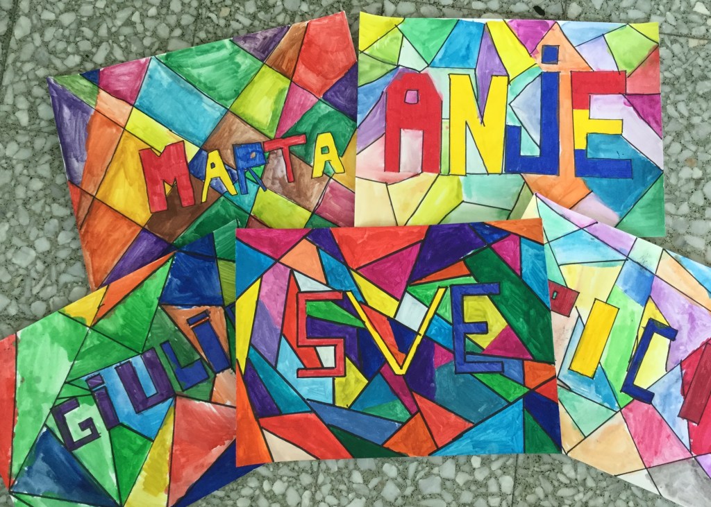 Al centro abbiamo disegnato il nome geometrico e poi abbiamo tracciato linee casuali formando così molte forme geometriche. Poi con i pennarelli abbiamo colorato il nome con i tre colori primari e con gli acquerelli abbiamo dipinto lo sfondo dando così sfogo alla propria creatività.