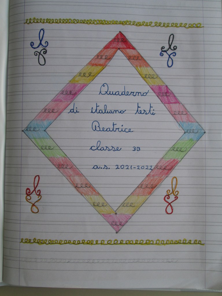 Anche per italiano abbiamo pensato quest’anno di far realizzare direttamente ai bambini la copertina del quaderno…pensiamo infatti sia bellissimo che si mettano alla prova ed esercitino la propria abilità e precisione anche sulle righe e non solo sui quadretti. Siamo molto soddisfatte del risultato, semplice ma di effetto. Cosa ne pensate?