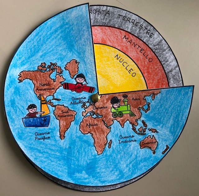 Per aiutare i bambini a fissare meglio nella memoria questi primi elementi di geologia, abbiamo costruito insieme un piccolo modellino ruotabile attraverso la sovrapposizione di quattro cerchi concentrici, fissati da un semplice fermacampione. Abbiamo scritto su ogni strato il rispettivo nome e li abbiamo colorati in modo diverso per visualizzarli con più chiarezza ed immediatezza.