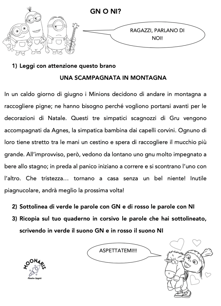 L’attività ha riscosso molto successo:in men che non si dica ci siamo esercitati ad ascoltare con attenzione e a discriminare i suoni di GN e NI e, allo stesso tempo, abbiamo riso nostro in compagnia dei nostri amati Minions mattacchioni. 😃