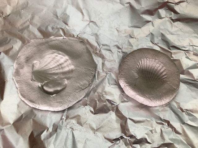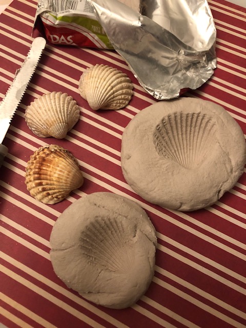 Sulla scia dell’entusiasmo riscosso dall’argomento proponiamo ai bambini di realizzare un fossile utilizzando soltanto una conchiglia, un panetto di das e la tempera marrone. Attraverso pochi semplici passaggi abbiamo avuto l’occasione di comprendere attraverso la nostra azione concreta come può originarsi un vero fossile.