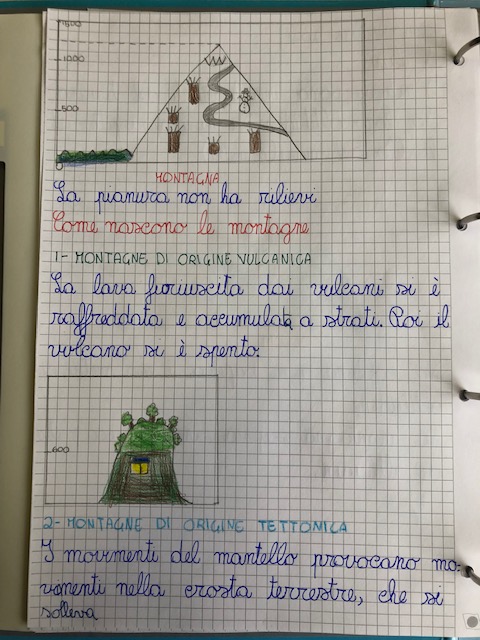 In classe terza abbiamo diffusamente trattato in questi giorni l’argomento dei rilievi in geografia. Siamo partiti con l’idea di individuare un criterio univoco per distinguere a colpo sicuro la montagna dalla collina e l’abbiamo trovato nel concetto di altitudine; la collina, infatti, è un rilievo che raggiunge un massimo di 600 metri rispetto al livello del mare, la montagna è un rilievo che supera i 600 metri. Abbiamo poi disegnato sul nostro quaderno alcune montagne e ne abbiamo evidenziato le parti essenziali: cima, piede, valle, passo, ghiacciaio…