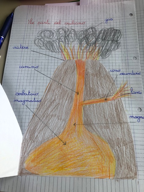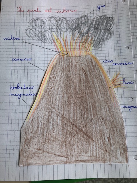 Per meglio sedimentare le conoscenze, chiediamo loro di rappresentare su un foglio un vulcano, sia esternamente sia nella sua struttura interna, inserendo in appositi cartellini le parti individuate in classe.