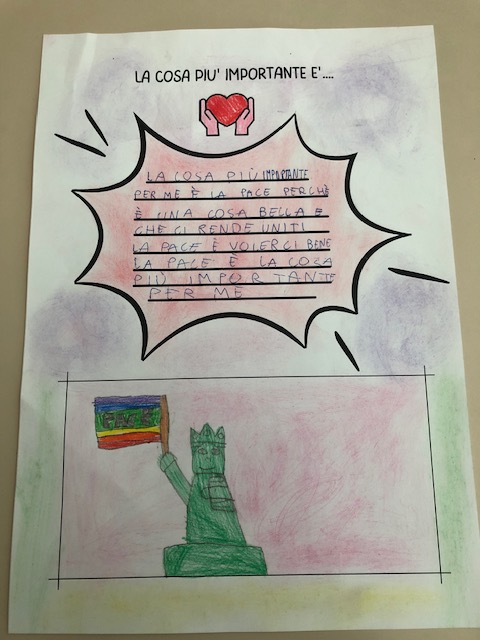 A partire dalle riflessioni suscitate da questo libro, abbiamo chiesto ai bambini di elaborare un pensiero su quale potesse essere per loro la cosa più importante e di rappresentarla su una scheda appositamente creata da noi per l’occasione. Ne è emersa una riflessione profonda e accesa sui diritti di tutti gli uomini e sull’educazione alla convivenza civile.