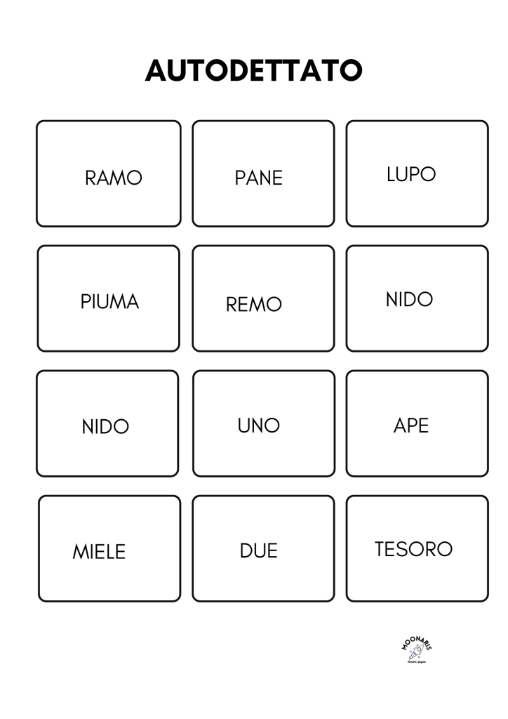 Attraverso l’utilizzo di immagini sapientemente selezionate dall’insegnante, i bambini possono lavorare in autonomia dettandosi da soli le parole e aiutandosi a vicenda nel riconoscimento dei suoni. Una volta composta la parola sul quaderno, i bambini potranno girare la pagina e controllare in autonomia la correttezza o meno della parola formata. Potranno così autocorreggersi e riflettere da soli sull’errore eventualmente commesso.