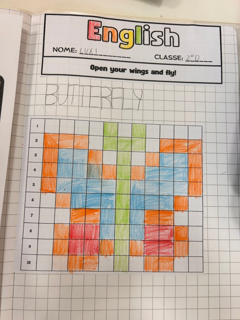 🇬🇧 In inglese, siamo partite dalla lettura del libro “The very hungry caterpillar” e hanno realizzato la farfalla con la pixel art. 🦋