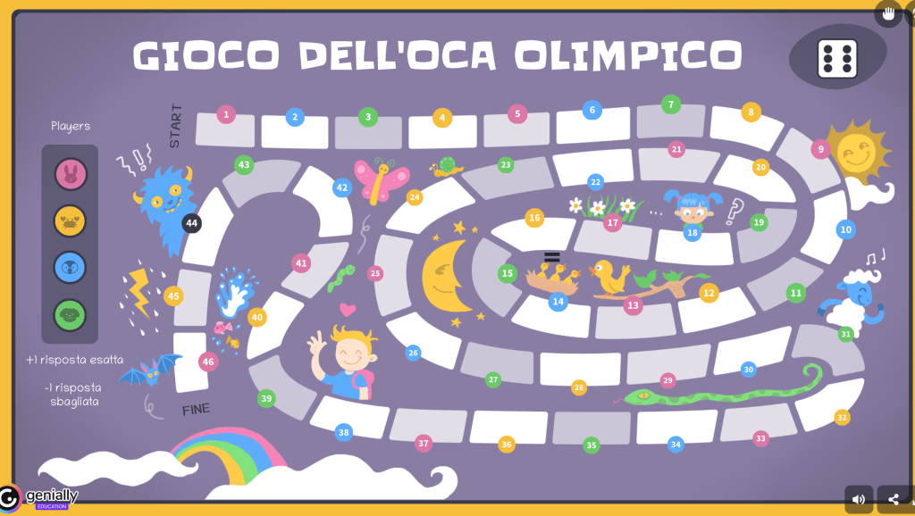 La nostra prima sfida del torneo è dedicata a un entusiasmante gioco dell’oca…olimpico! Con Genially ci siamo divertite a creare un’inedita versione del gioco da tavola più famoso al mondo e abbiamo pensato di metterla a disposizione di tutti coloro che fossero interessati ad utilizzare questa proposta in classe. Averla è molto facile: è sufficiente cliccare sul seguente link ⤵️