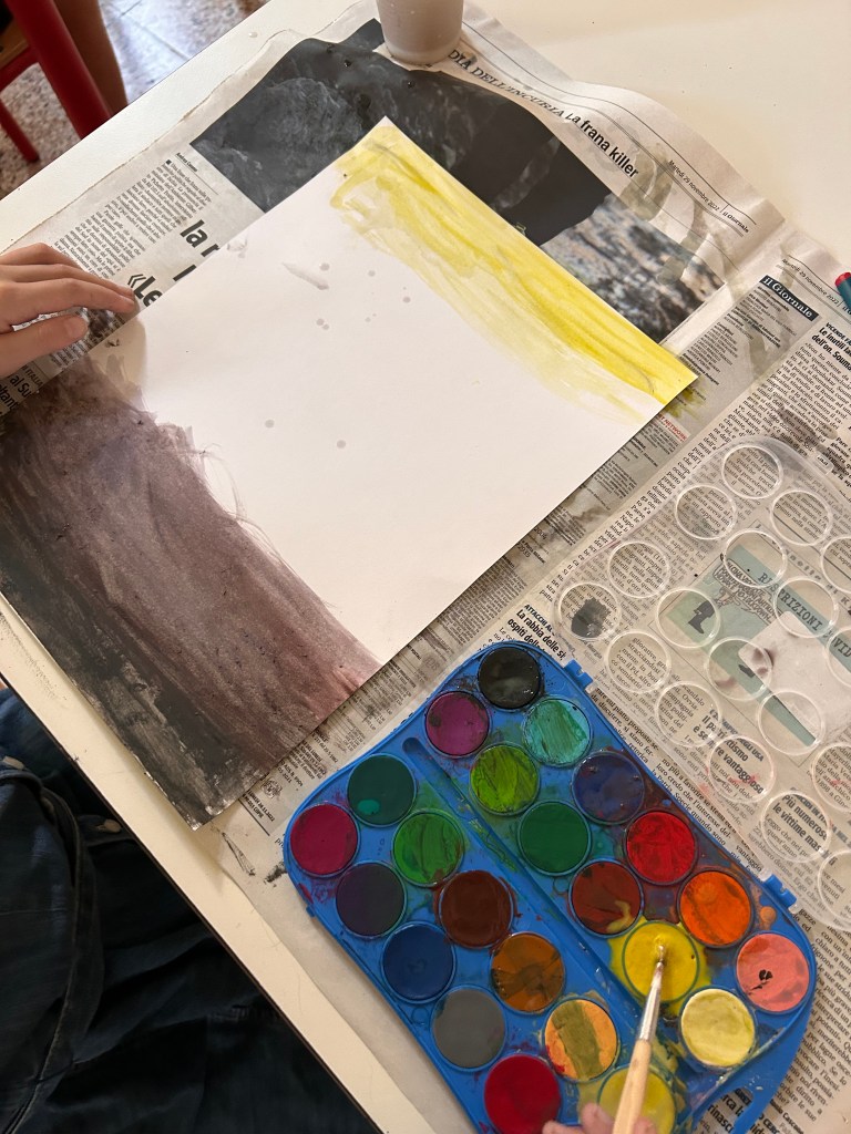 Il lavoro pratico è iniziato con la realizzazione dello sfondo del quadro 🖌️, utilizzando gli acquerelli per creare tonalità morbide e sfumate.