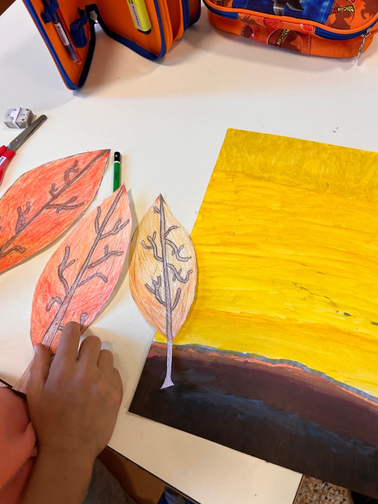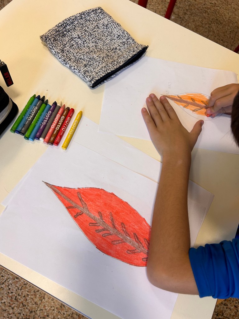 Successivamente, i bambini si sono dedicati al disegno delle tre foglie 🍂 protagoniste dell’opera, rispettando con attenzione le proporzioni 📏. Per dare vita e texture alle foglie, i piccoli artisti le hanno colorate con i pastelli a cera 🖍️, scegliendo con cura le sfumature giuste.