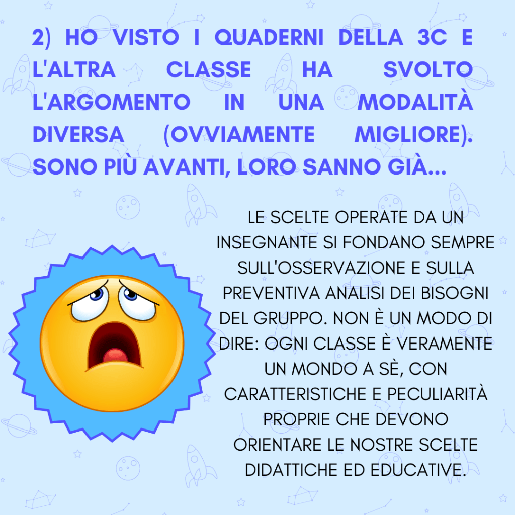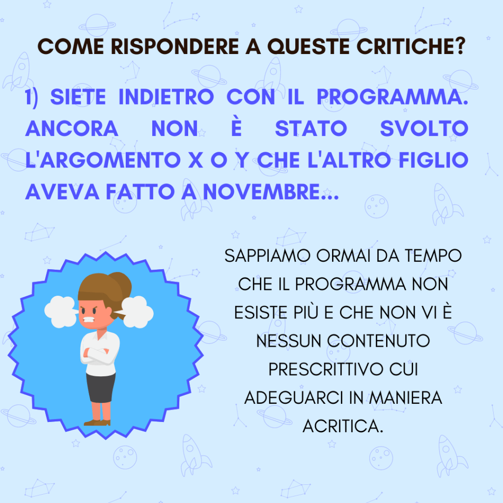 A volte esse si poggiano su presupposti solidi e possono essere per noi un profondo spunto di riflessione ed auto-analisi; altre volte invece, esse si basano su conoscenze errate e false convinzioni. A noi dunque l’onere di rispondere con tatto e diplomazia, ma anche difendendo con orgoglio le scelte didattiche effettuate. Siamo professionisti del settore ed esperti di educazione, non lo dobbiamo dimenticare mai! 👩🏫👨🏫🧑🏫
